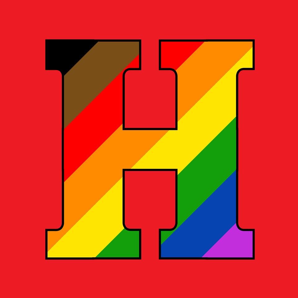 HIngham Pride Logo: The letter H filled in with diagonal colors of black, brown, red, orange, yellow, green, blue and purple. Background is red which is the Hingham school color.